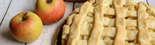 Picture of an apple pie with a lattice pie crust (right) on with two red and yellow apples (left). Image Credit.